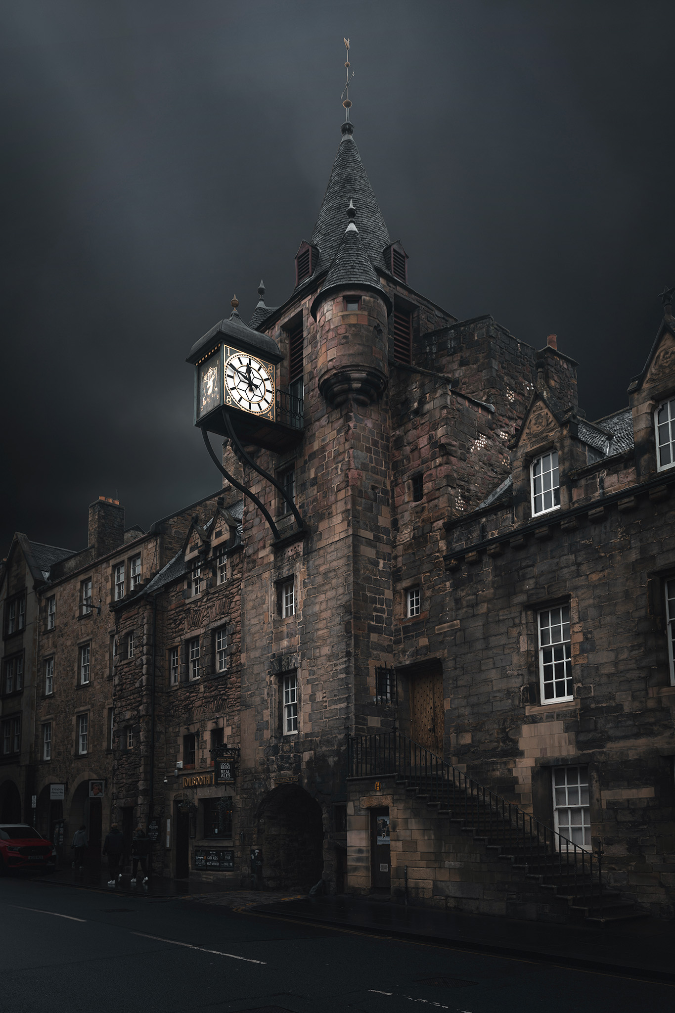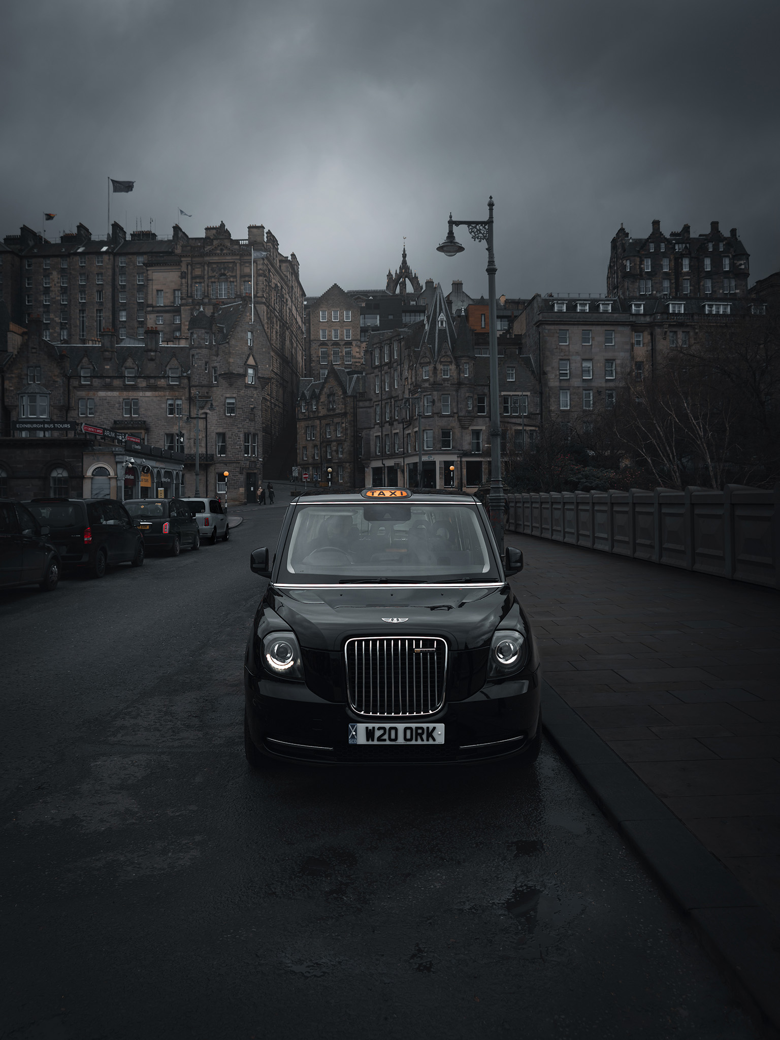 There is no excess. A clock projects quietly over the Royal Mile. A narrow building rises with improbable certainty. A lone cab rests beneath the weight of centuries. Each frame is composed without insistence, held in balance between light and absence.