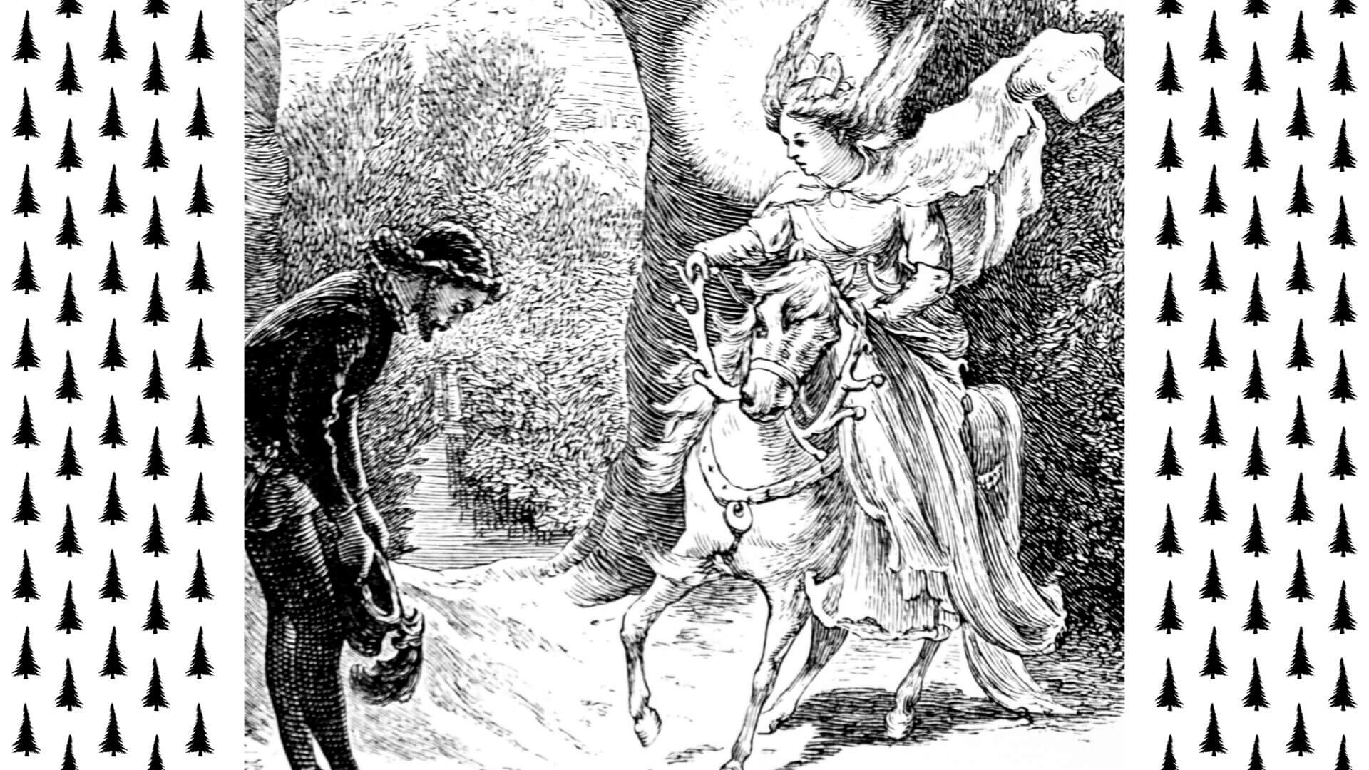 As he was lying there, he heard the trampling of a horse’s hooves, as it forced its way through the bushes; and, looking up, he saw the most beautiful lady that he had ever seen coming riding towards him on a grey palfrey.